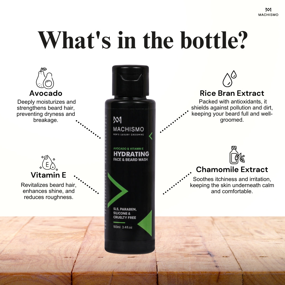 Machismo Hydrating Face & Beard Wash is a power-packed grooming essential designed to cleanse, nourish and strengthen your beard while keeping the skin underneath hydrated and irritation-free. Enriched with Avocado, Rice Bran Extract, Vitamin E and Chamomile Extract, our face & beard wash removes dirt, pollution and daily buildup while keeping your beard soft and nourished.