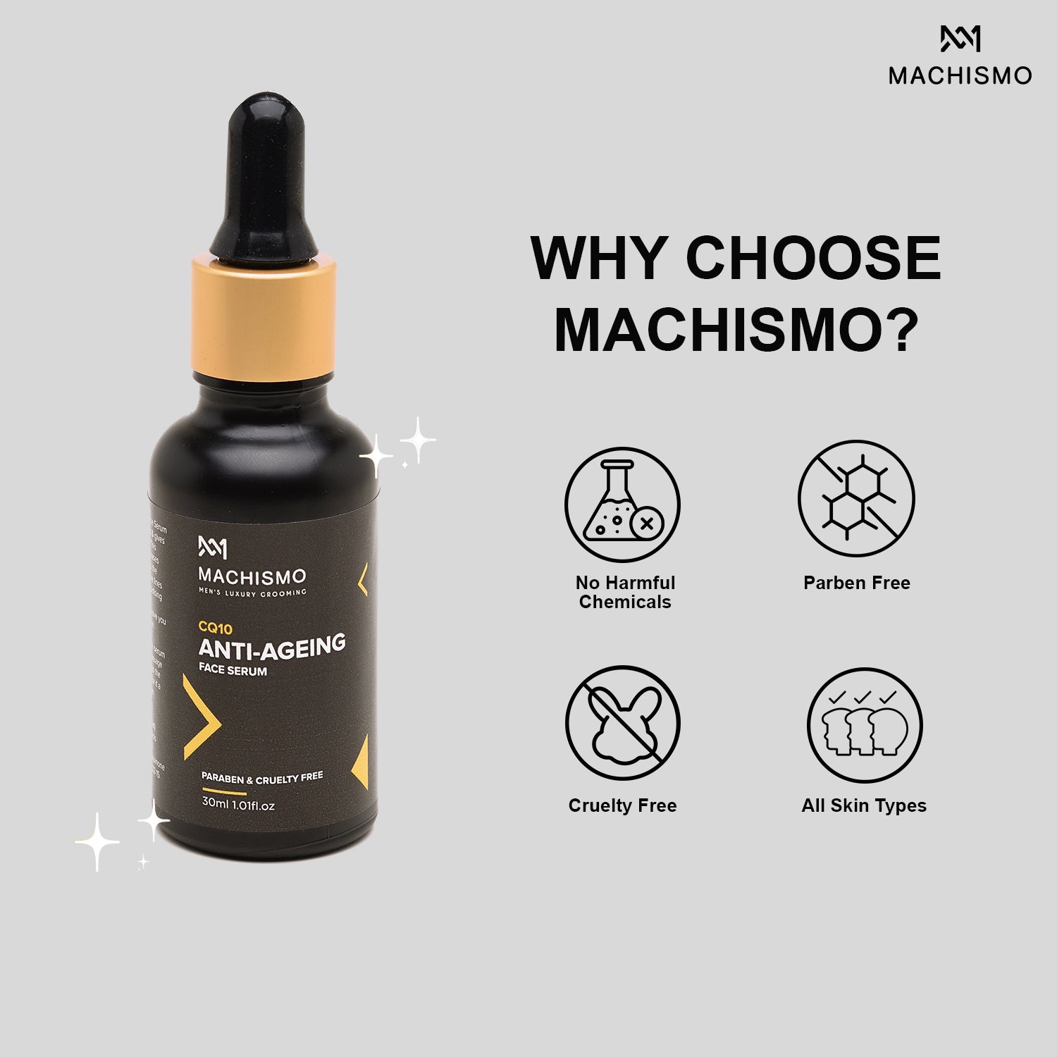 Machismo's CQ10 Anti-Ageing Face Serum bids farewell to premature ageing & gives your skin all the energy it needs.